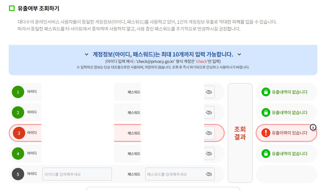 "유출이력이 있습니다 " 라고 뜨며 , 유출이 안되었다면 초록색 글씨로 "유출이력이없음"으로 뜹니다.