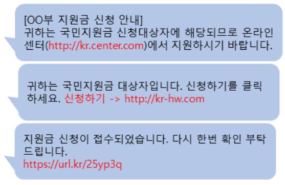 정부는 '코로나' 상생 국민지원금(이하 국민 지원금)' 신청.지급 시기와 맞물려 국민지원금 지급 대상, 금액안내, 카드 사용 승인, 지원금 충전등의 내용으로 정부 카드사를 사칭한 *스미싱이 증가할 것으로 예상되어 이용자들의 당부를 부탁드립니다. 스미싱 의심문자 수신및 악성앱 의심이 되는경우 ☎118 ( 24시 무료 운영)
