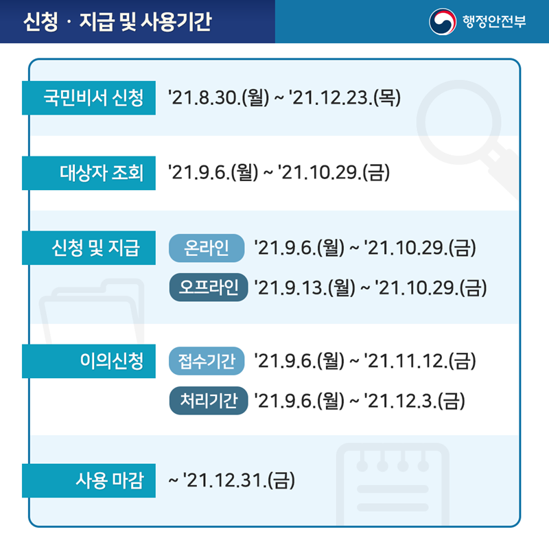 오프라인 신청은 카드와 연계된 은행창구(은행방문시 신분증(주민등록증,운전면허,여권등) 지참) ,주소지 읍.면.동 주민센터에서 신청가능하며, 출생년도 끝자리별로 요일제로 순차적으로 신청 가능합니다. (대상자 조회는 불가능합니다)