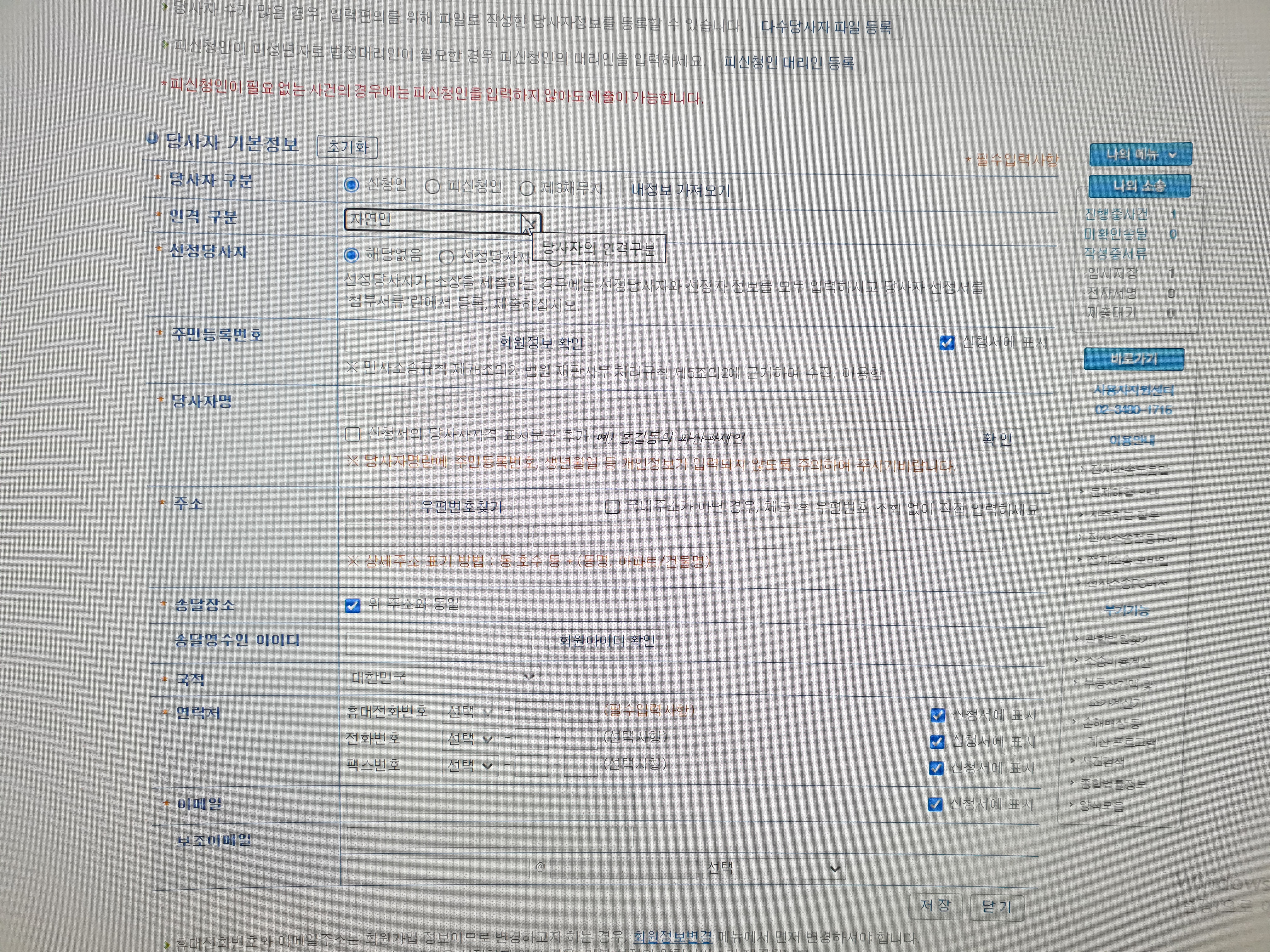 당사자 (임차인) 기본정보 *자연인 *주민번호 * 당사자명 * 주소 * 국적 *연락처 *이메일 을 기입합니다.