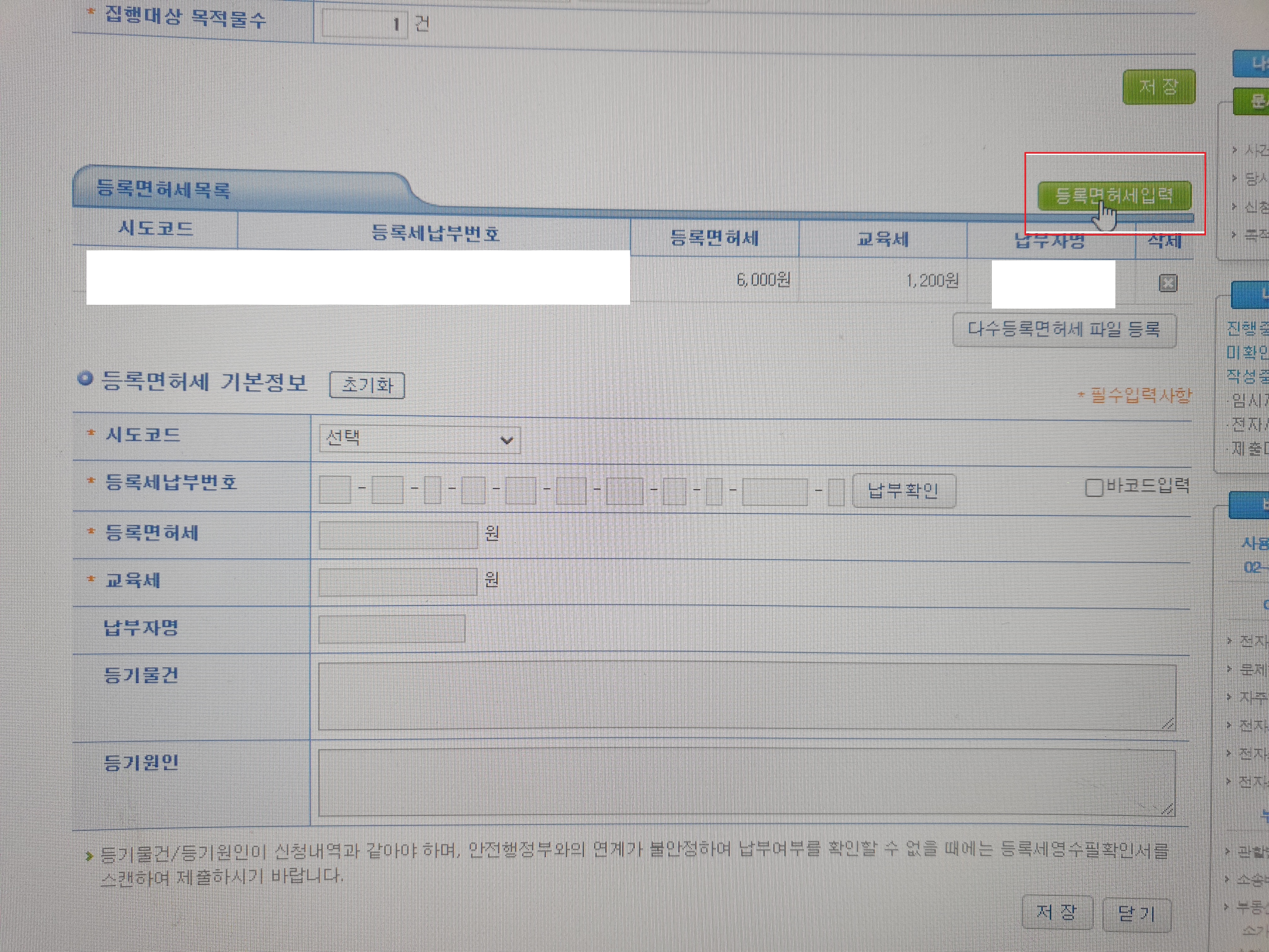 3 . 대법원 전자소송 사이트에 (등록면허세및 등기촉탁수수료기입)