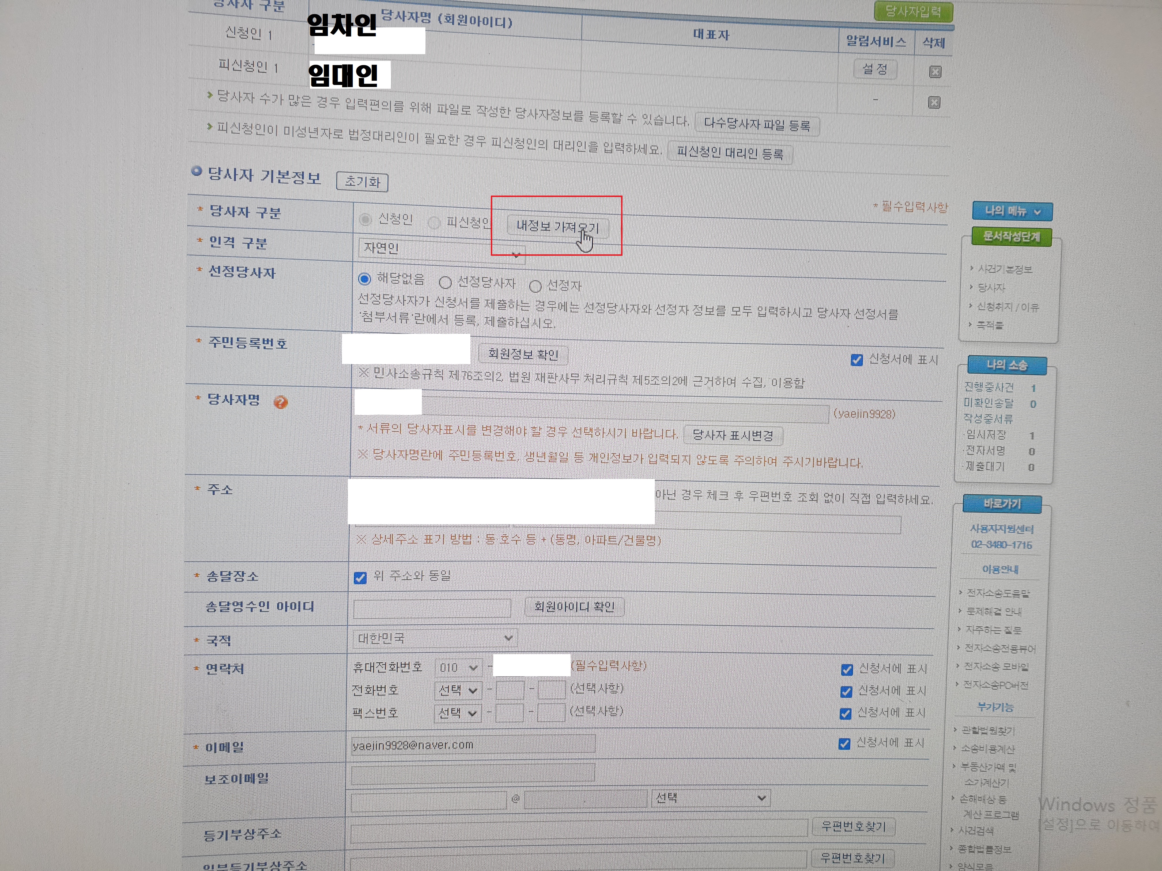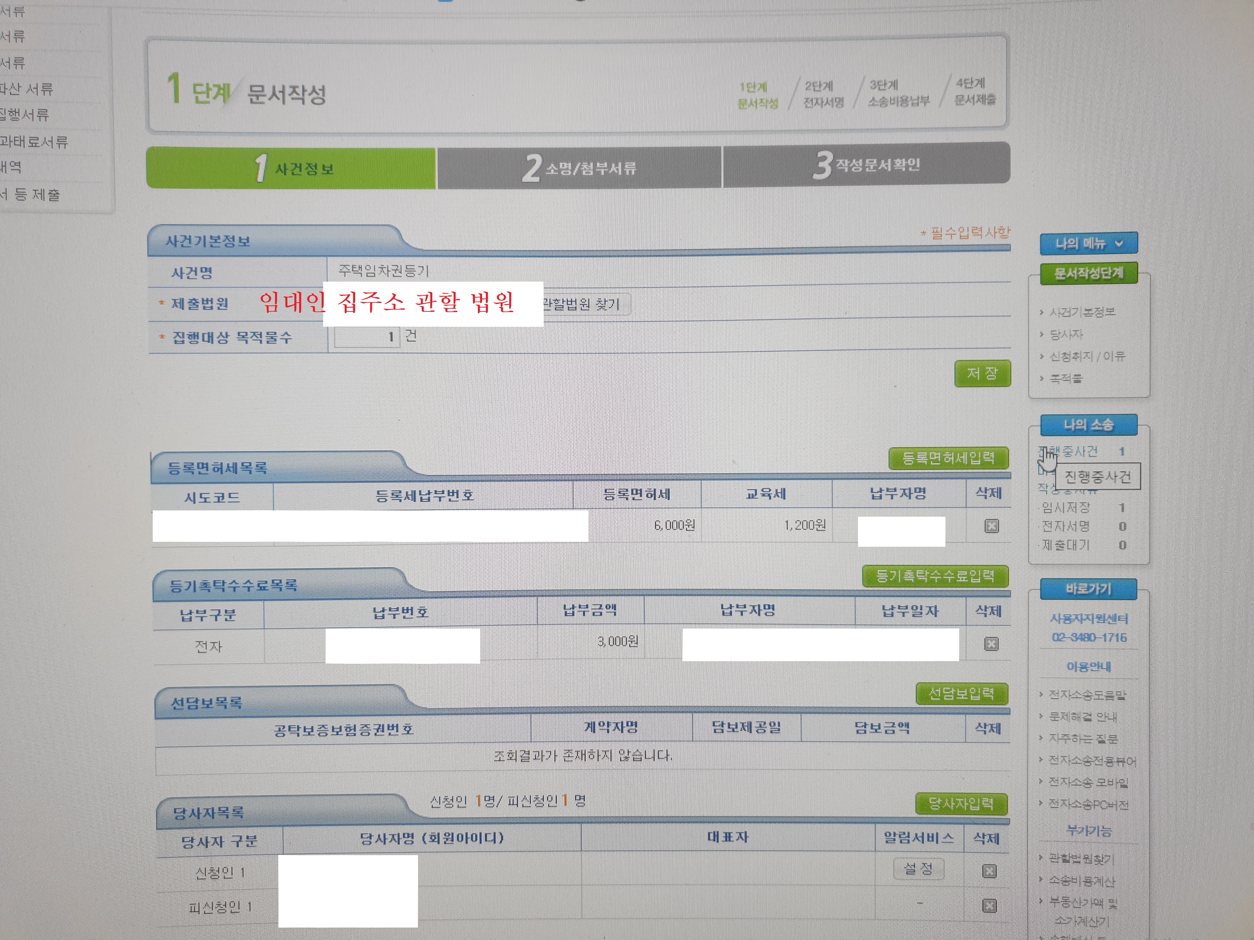 2-1 사건 정보 기입 (관할법원 = 임대인 주소 관할지)