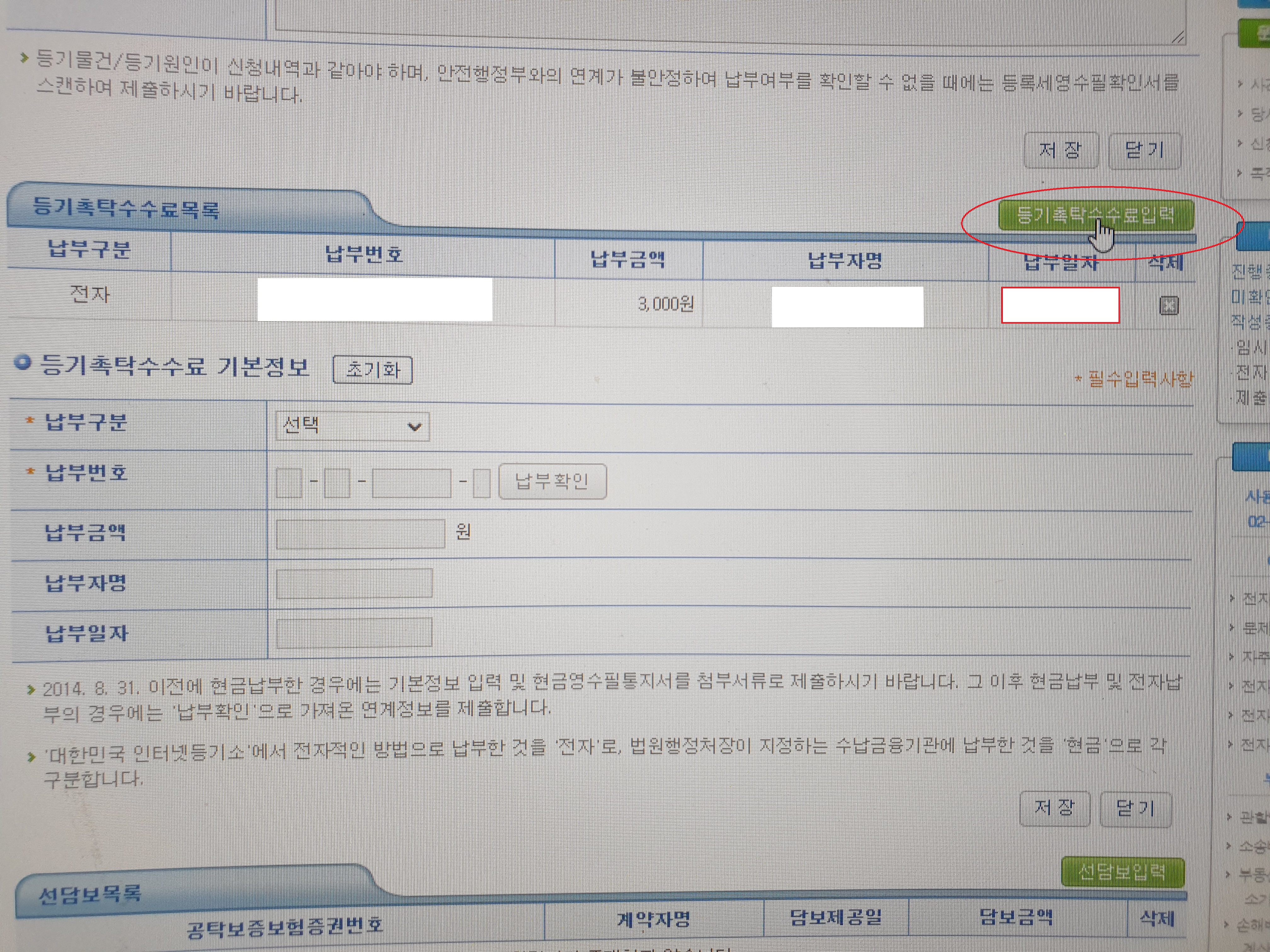 등기 촉탁 수수료에 등록번호 기입후 "저장" 합니다.