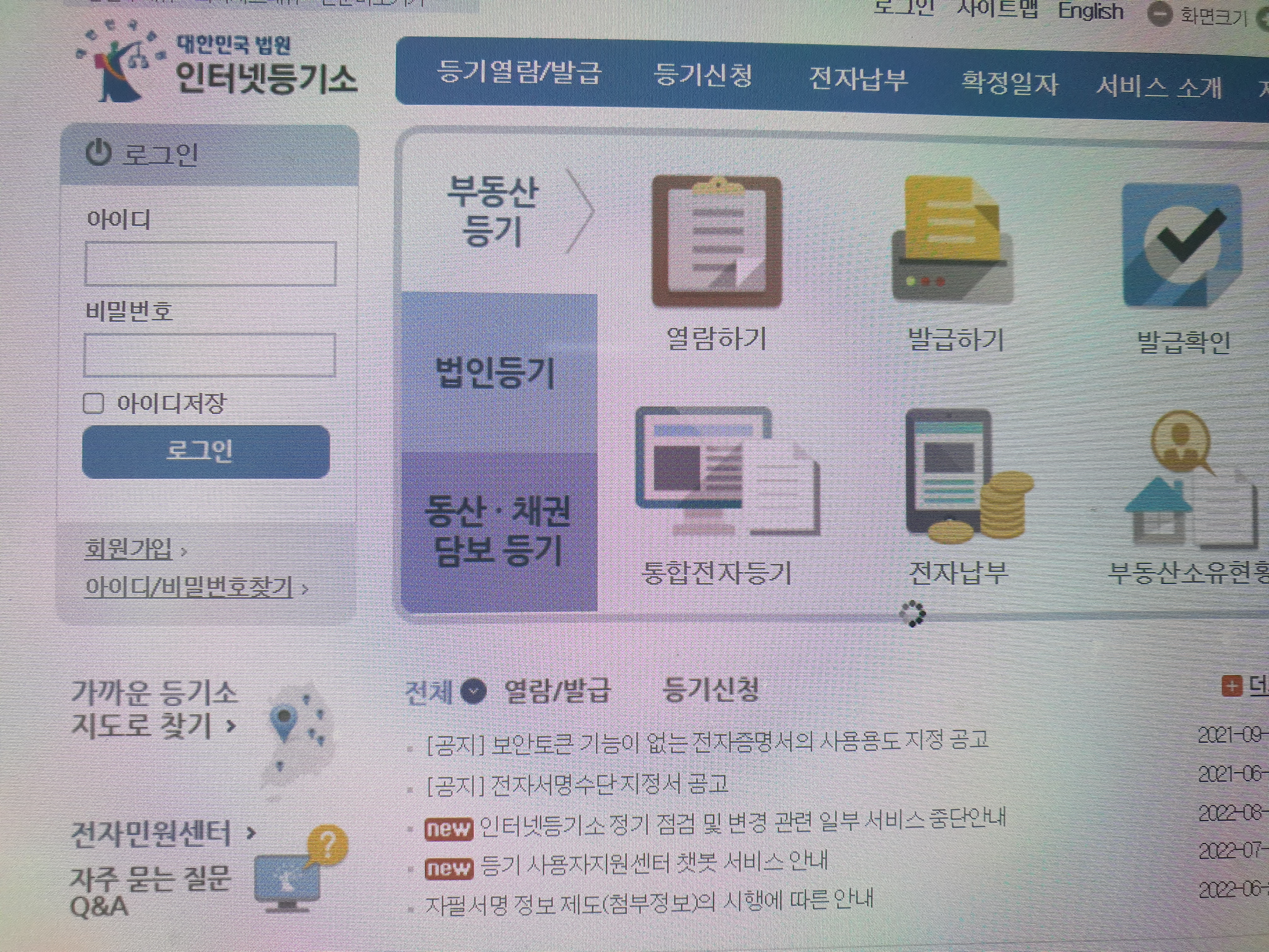 인터넷 등기소 접속 후