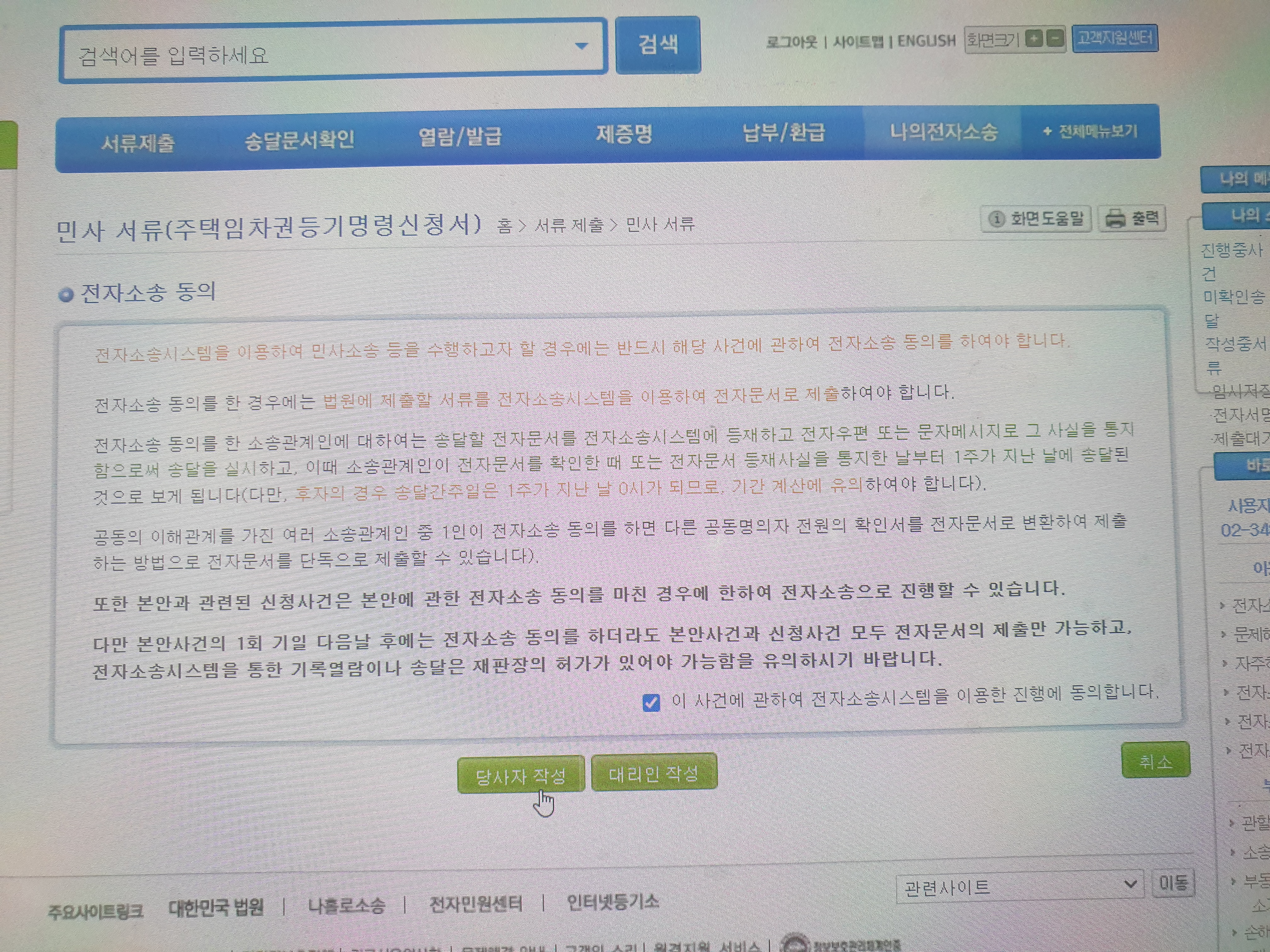 ' 이 사건에 관한 전자소송시스템을 이용한 진행에 동의' 체크 후 '당사자 작성'