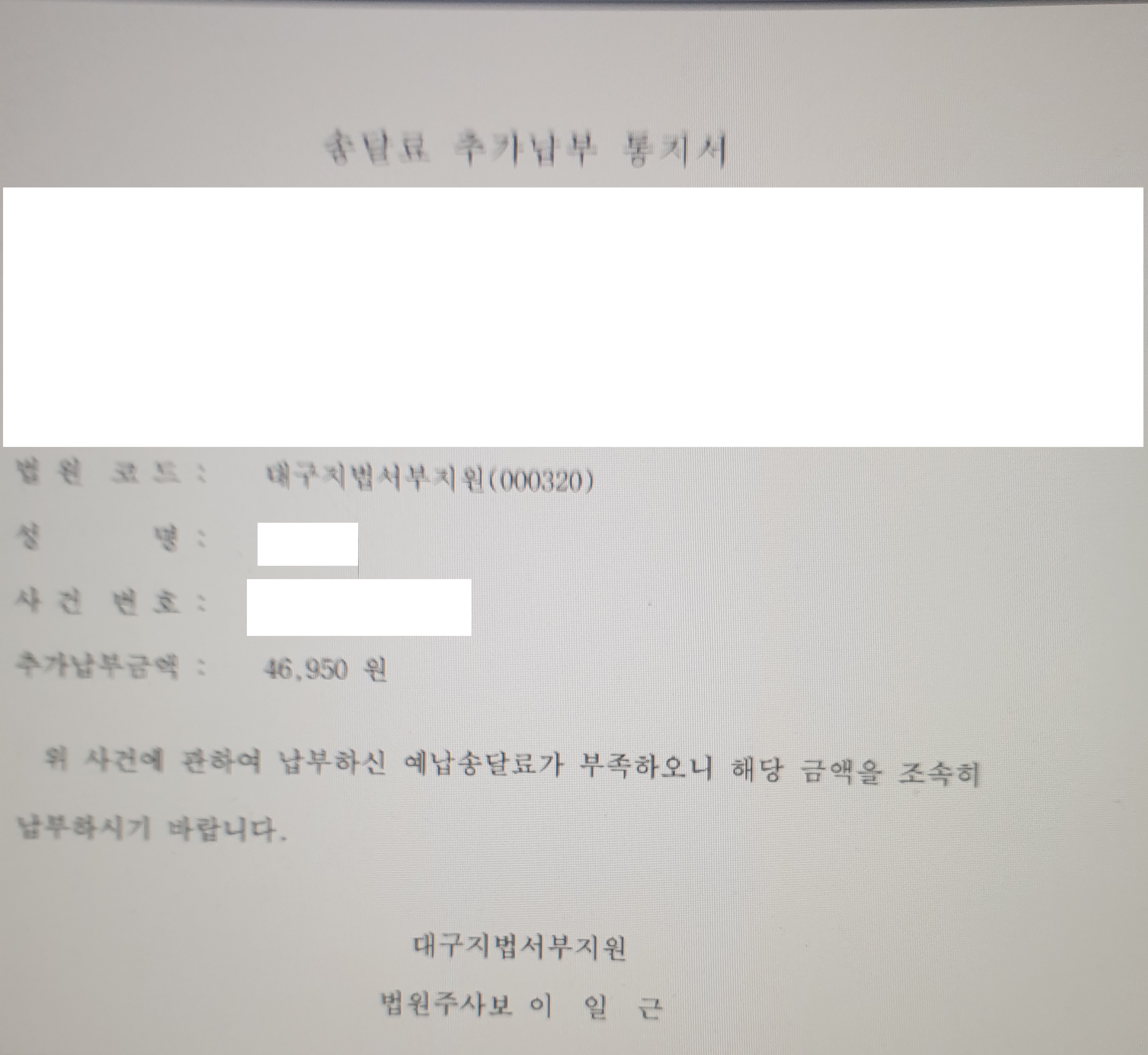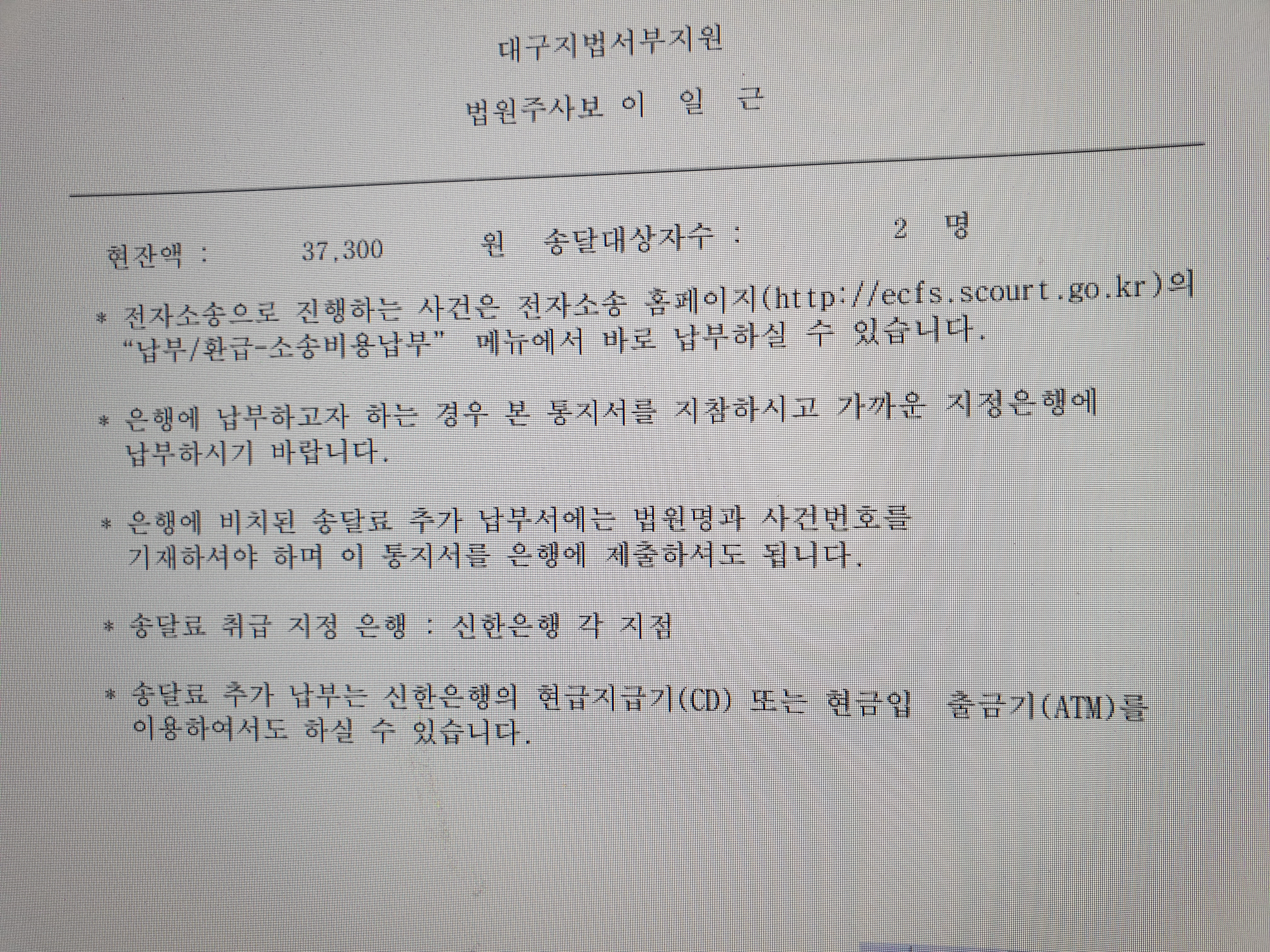 이렇게 또 하나씩 알아가는 하루하루 속에서 법원에서 송달료 추가납부통지서가 발급되었습니다.