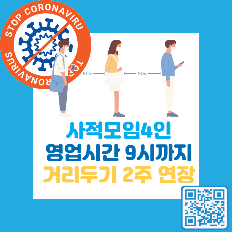 오후 9시까지로 사회적 거리두기를 2주간 연장하기로 결정했습니다.