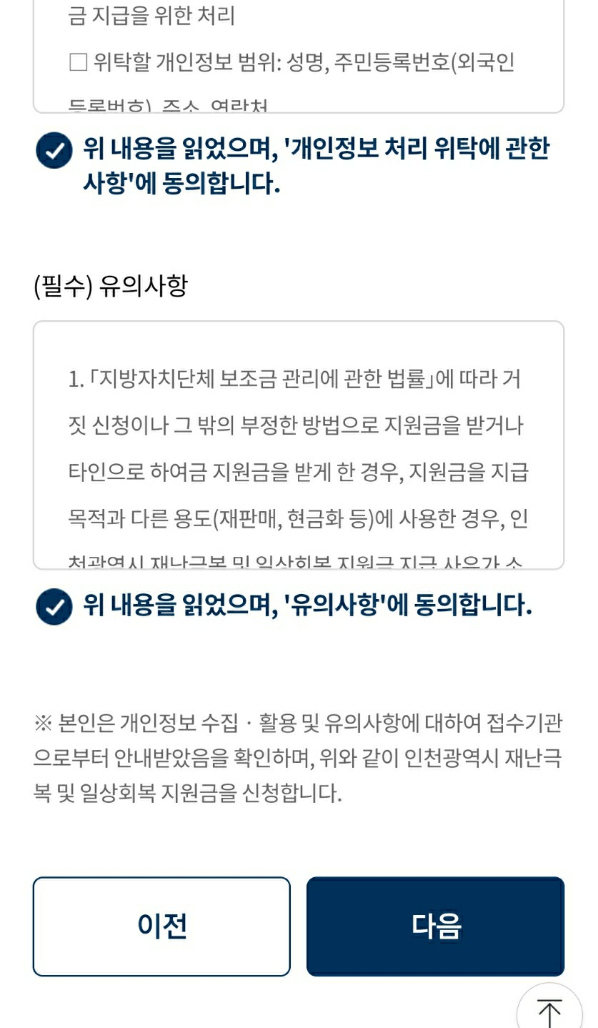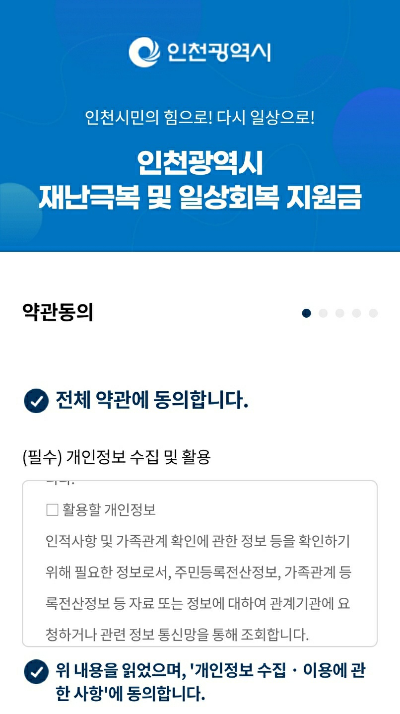 ③ 신청하기에 들어가시면 위 안내 사항을 파악 하신후에 "약관동의" 전체 동의를 확인 후 다음 버튼 클릭