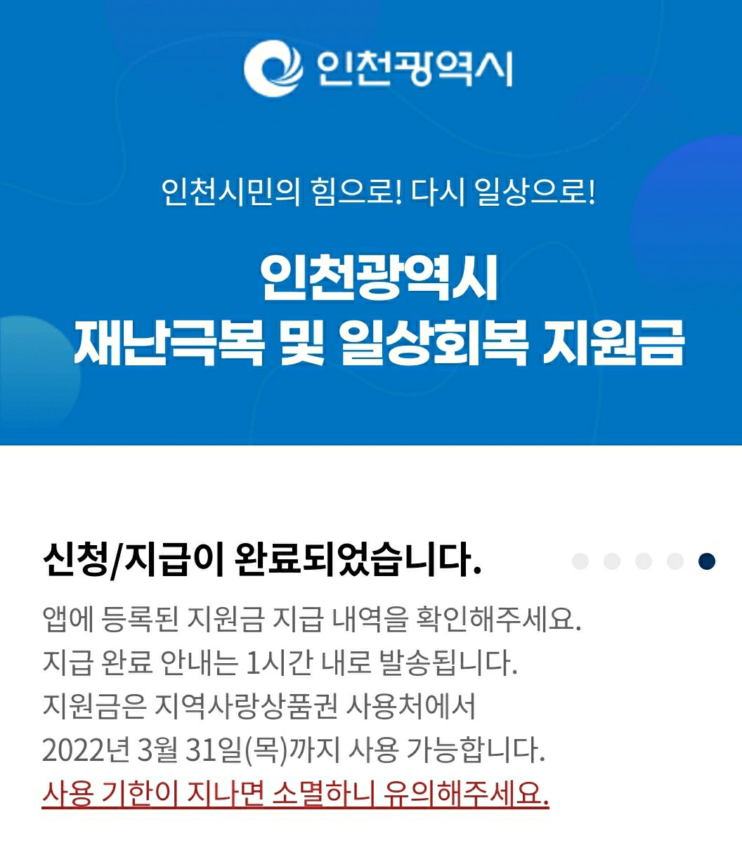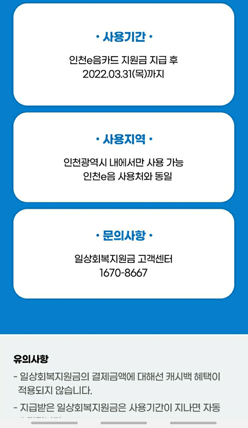 * 사용 기간 : 인천 이음 카드 지원금 지급후 22년 3월 31일 목요일까지 사용가능합니다.