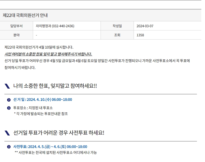 투표소 위치는 선거관리위원회가 우편 발송한 투표안내문을 통해 다시 한 번 확인하시기 바랍니다.