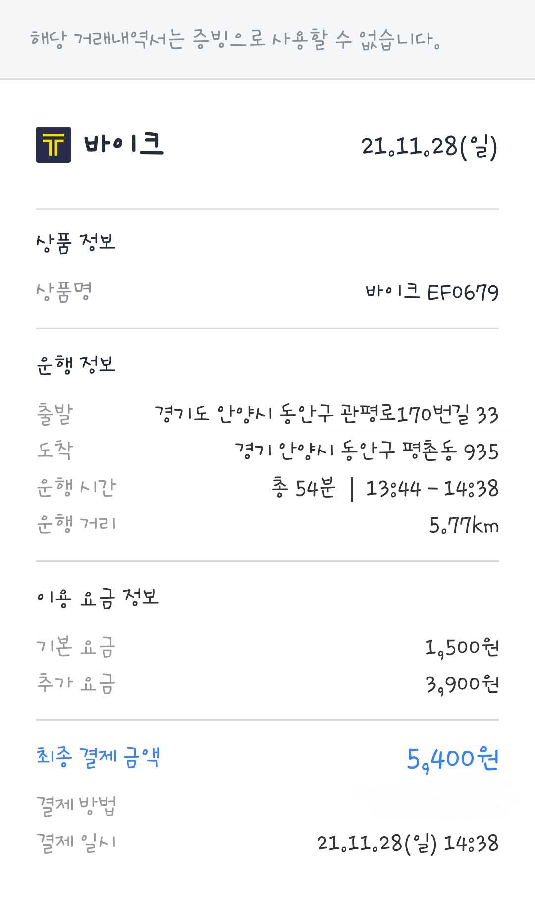 총 54분 주행해서 총 금액 5,400원 나왔어요. 서울시 따릉이를 생각하면 저렴한 것같진 않아요.