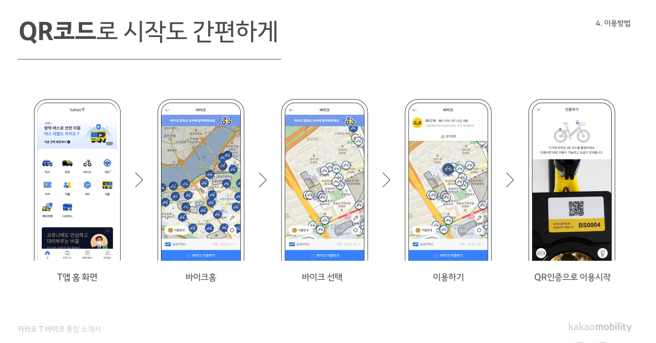 대여하는 방법으로는 우선 카카오 T 어플을 실행시킨 후 탭에서 자전거의 위치를 확인 후 자전거에 붙어 있는 QR코드 혹은 문자를 기입하여 대여해주면 됩니다.