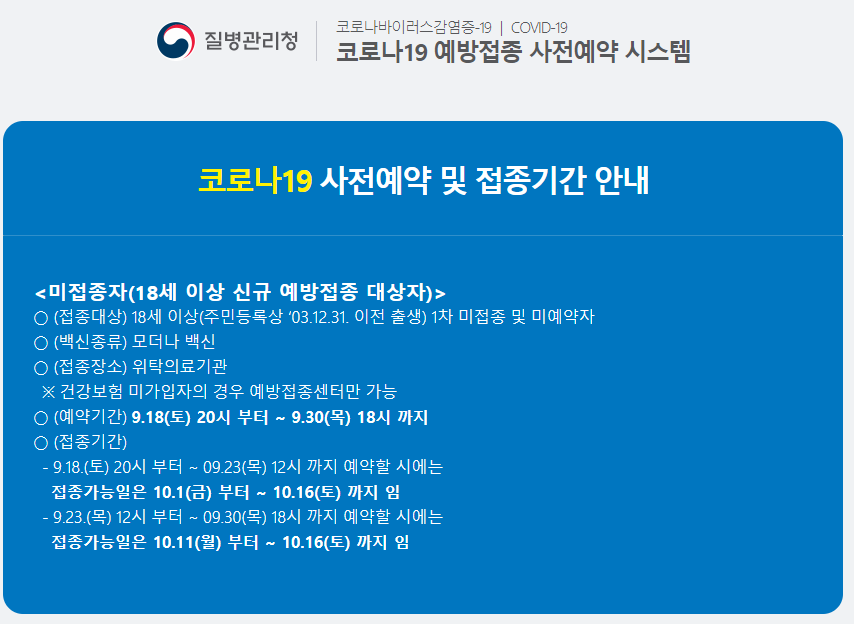 | 접종 | 10월18일(월) ~ 11월 23일(토) | 11월1일 (월) ~ 11월 27일 (토) |