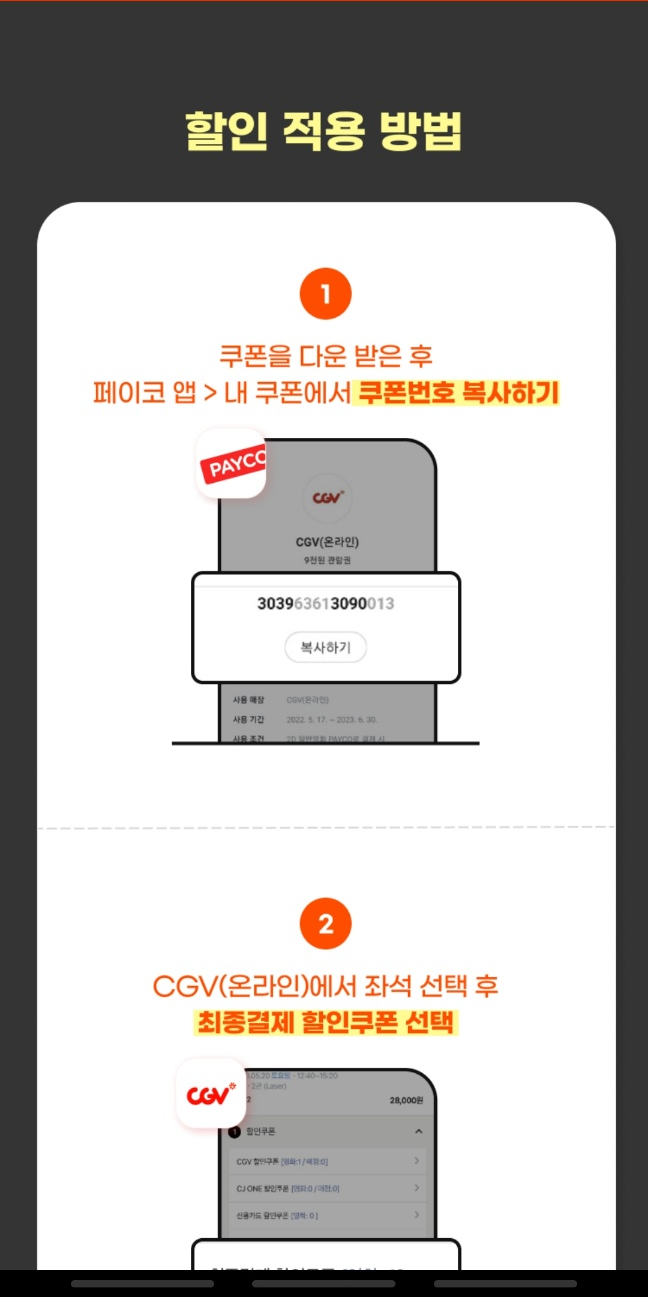 페이코 앱에 받은 쿠폰번호 복사하여 CGV 어플에 접속해서