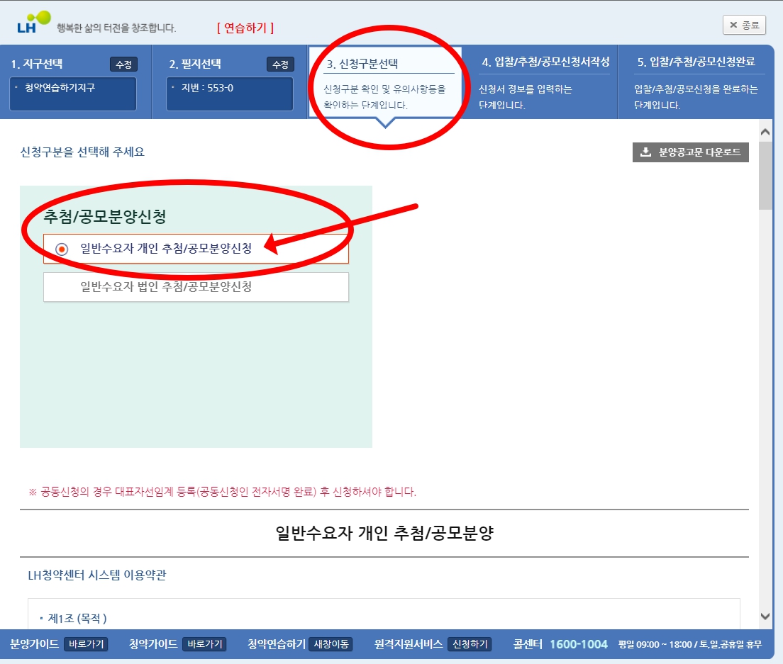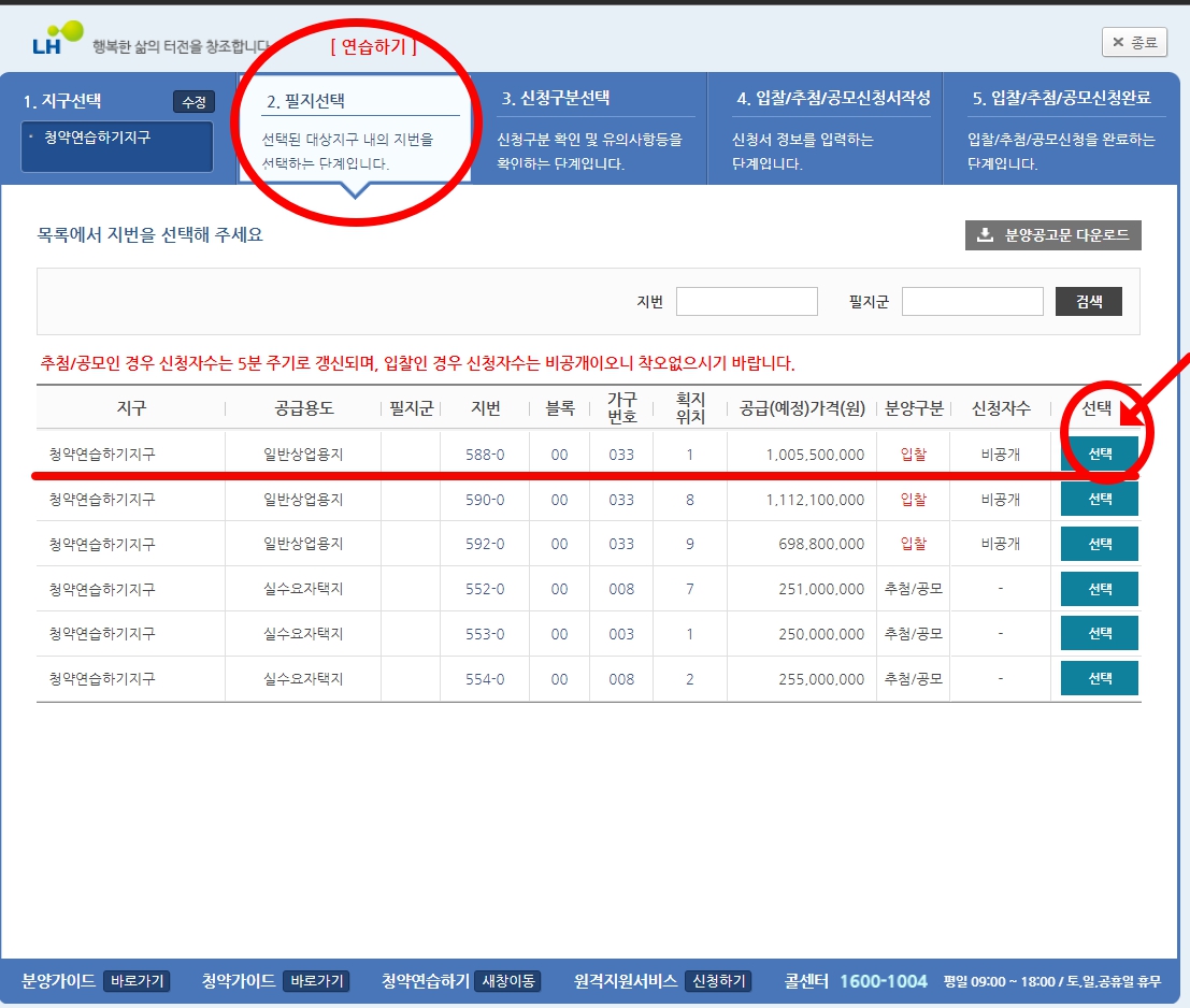 ② 지역, 지구, 블록, 공급유형 확인 후 선택 후 클릭 (청약을 진행하실 대상 지구및 블록을 선택)
