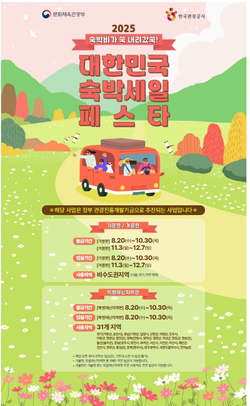 대한민국 숙박세일 페스타는 문화체육관광부와 한국관광공사가 주관하는 국내 여행 장려 캠페인입니다. 매년 시즌별로 진행되며, 2025년에도 전국 숙박업소와 온라인 여행사를 통해 대규모 할인 혜택이 제공됩니다.