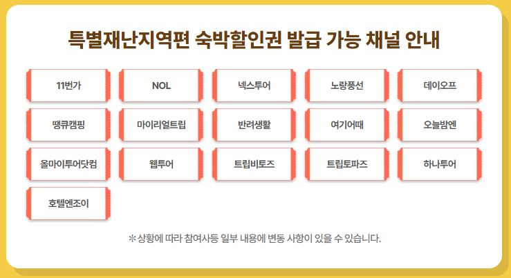 - 야놀자, 여기어때, 인터파크, 11번가, 쿠팡 트래블, 마이리얼트립, 하나투어, 호텔패스 등 다양한 플랫폼에서 참여 가능합니다.