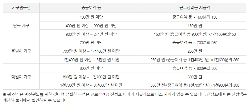 (근로 장려금은 가구원 구성에 따라 정한 부부합산 총 급여액 등을 기준으로 지급액을 산정합니다)