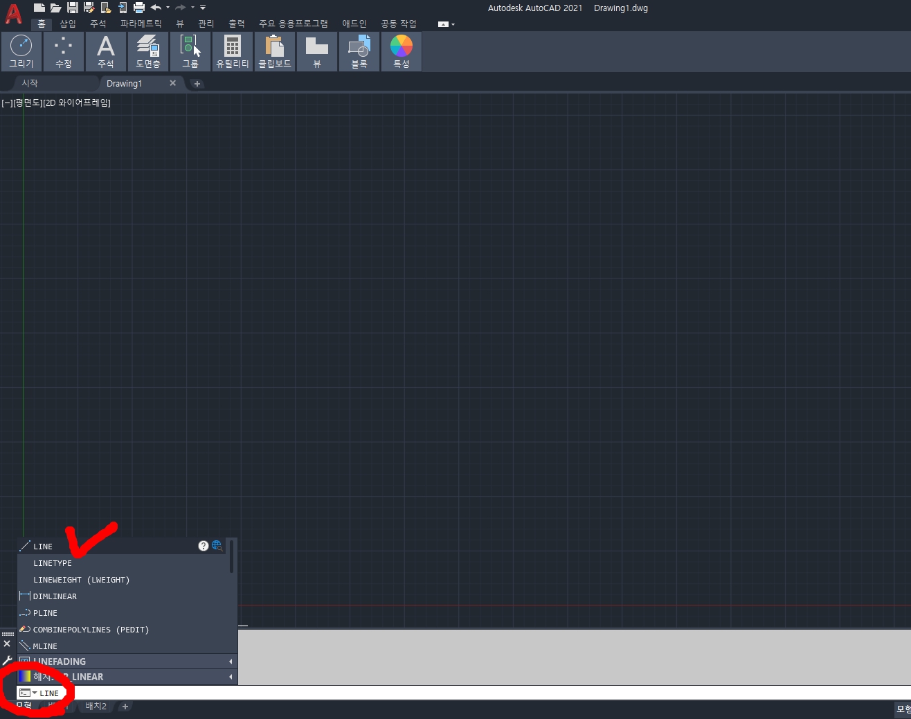 명령어 창에 LINE을 입력하고 Enter를 누릅니다.