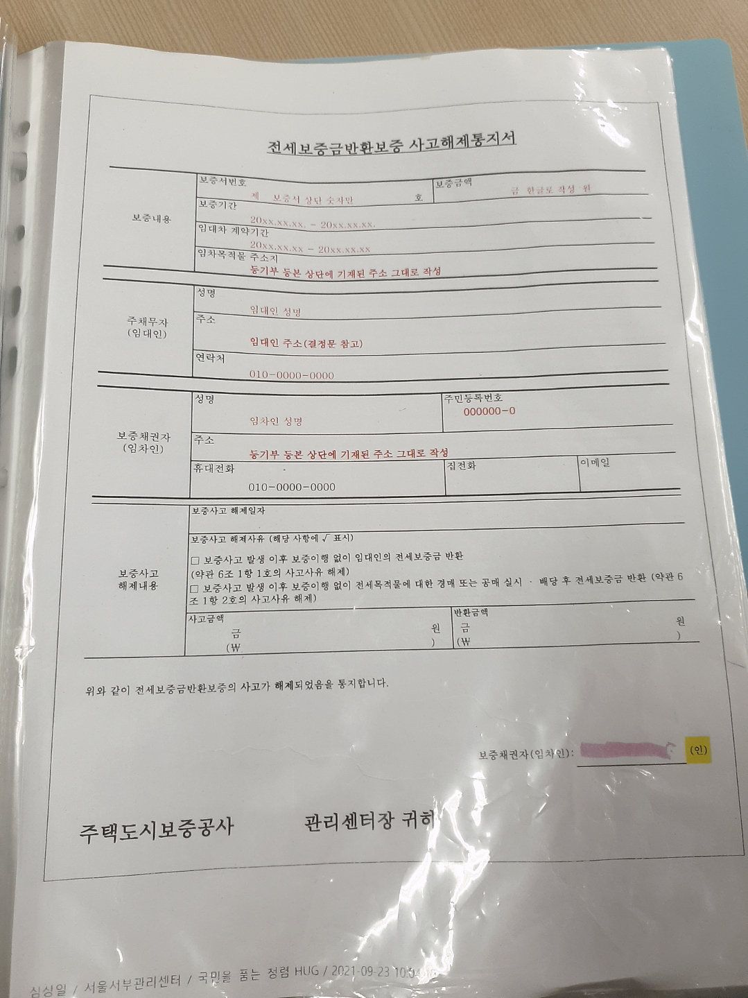 전세보증금 반환 보증 사고해제 통지서 작성예시 11)