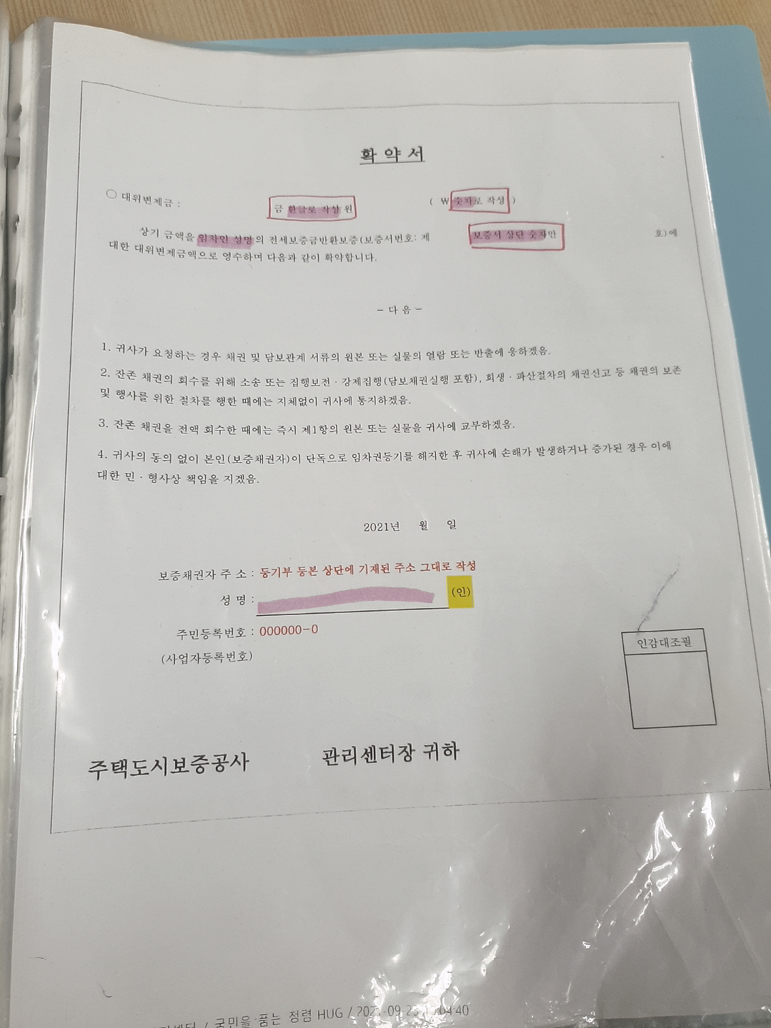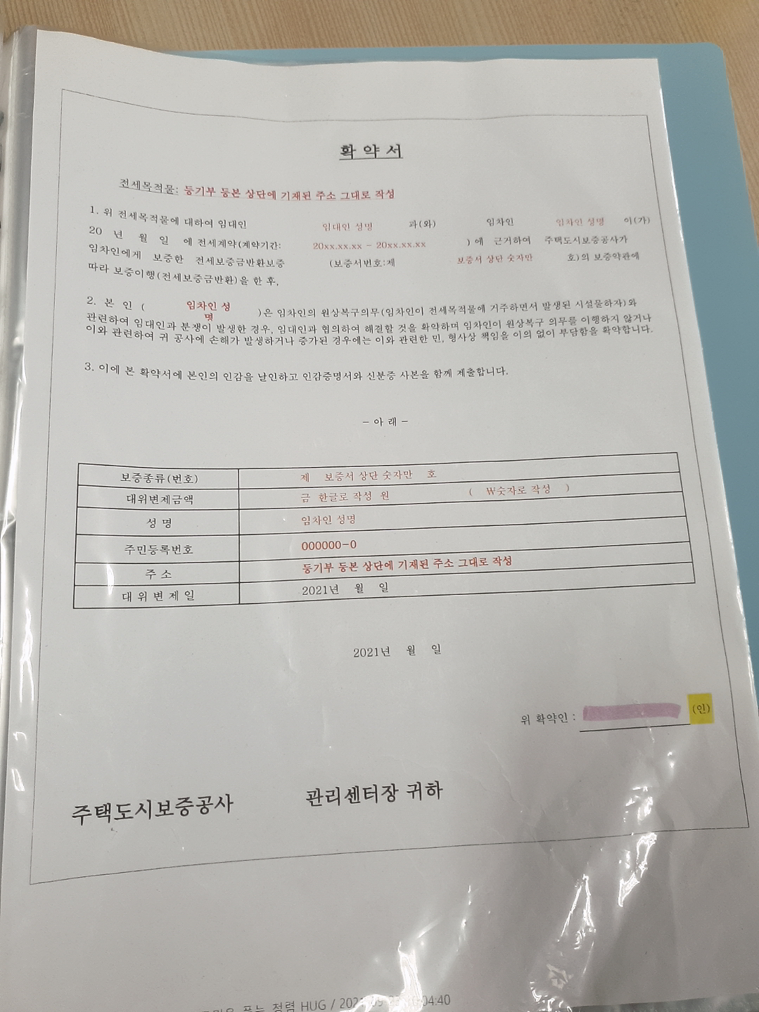 확약서 작성예시 3)