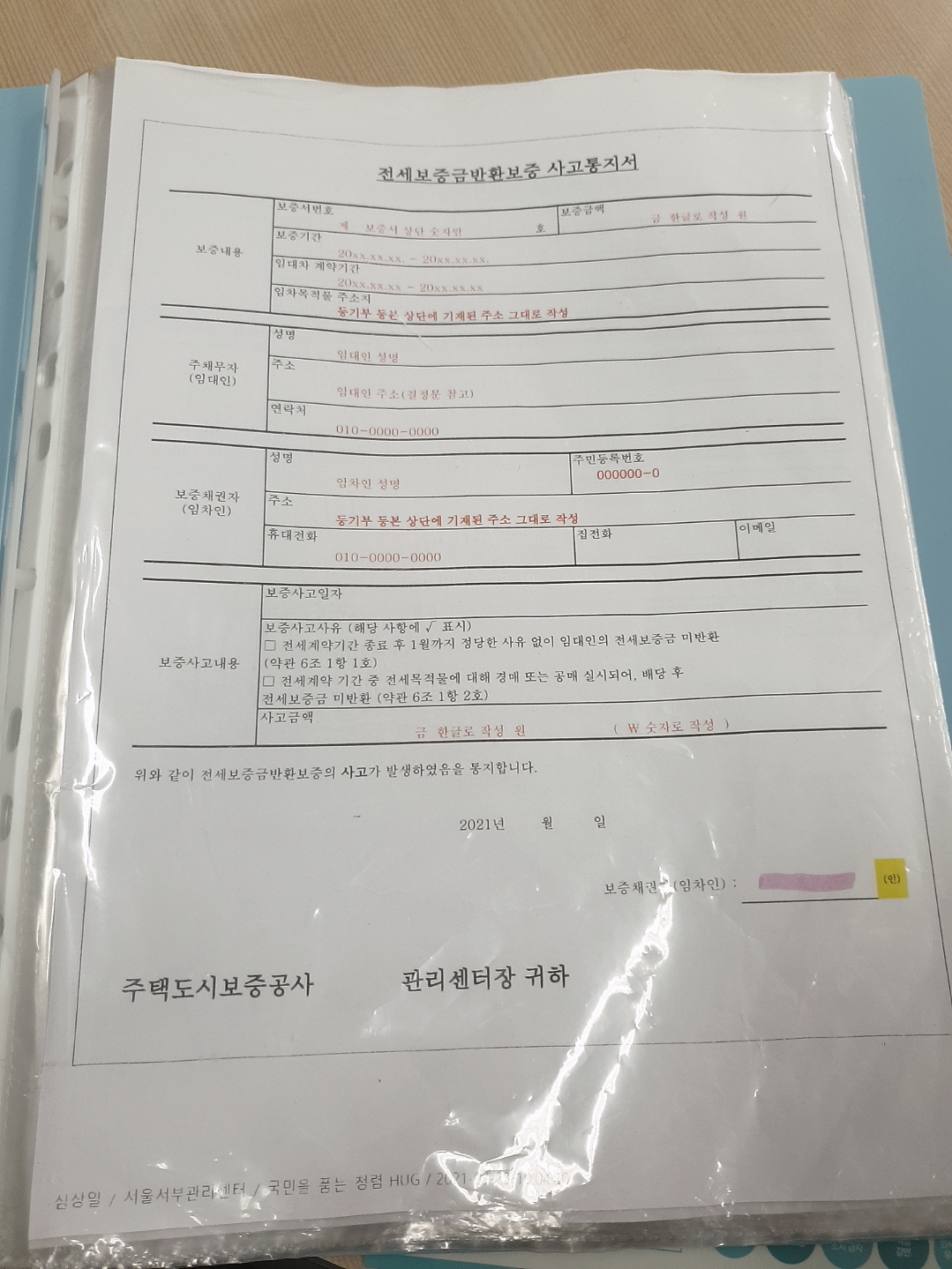 전세보증금반화보증 사고 통지서 작성 예시 1)